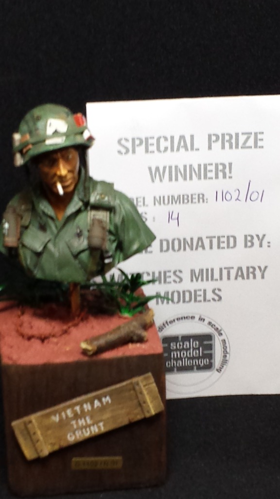 Huh? was de prijsuitreiking nu al begonnen? Dus ik snel naar het podium. Inderdaad, ik had prijs! Het is een special prize, die word uitgerijkt door de handelaren aanwezig op SMC. Deze prijs is is geschonken door Mitches military models. Zij vonden van alle bustes die daar stonden, die van mij het best! Owh wat een eer, er stonden er veel, dus wat bijzonder zeg!